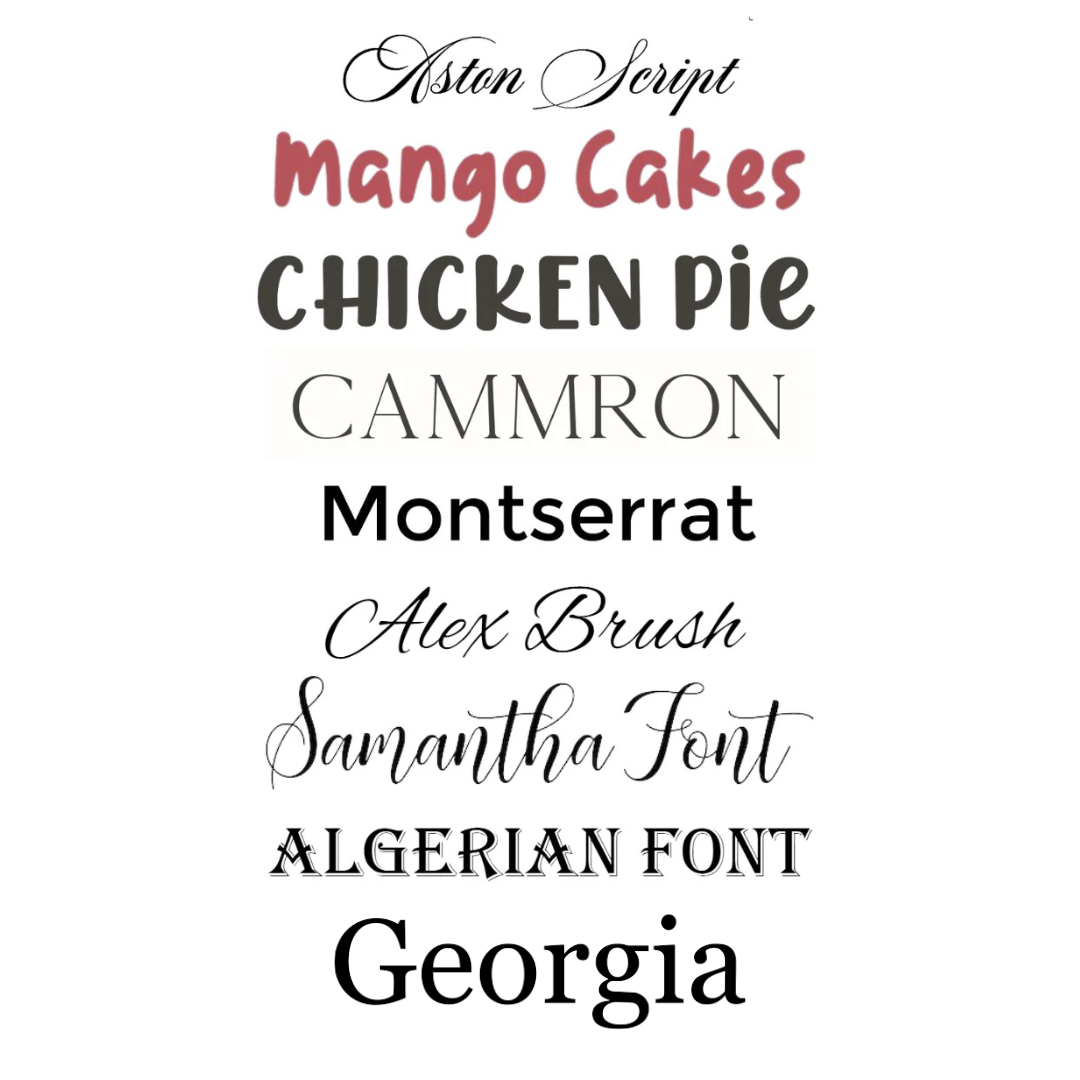Please choose your font from http://www.dafont.com add to text box or email us with your selection.